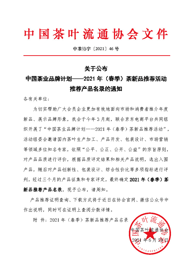 关于公布中国茶业品牌计划——2021年(春季)茶新品推荐活动推荐产品名录的通知