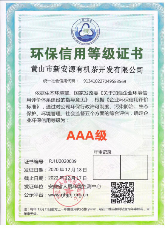 近日,安徽省人居环境监测中心公布了2020年度环境信用评价结果,其中黄山市新安源有机茶开发有限公司通过AAA级企业环保信用等级认证。